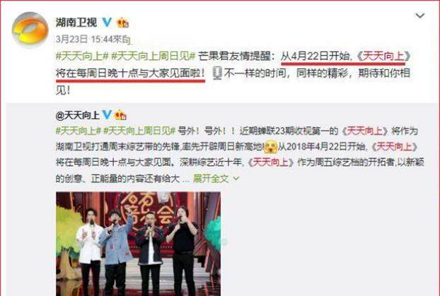 此后,在内娱综艺节目频出的大环境下,毫无竞争力的《天天向上》连遭滑铁卢,被迫改到了周日晚10点播出。